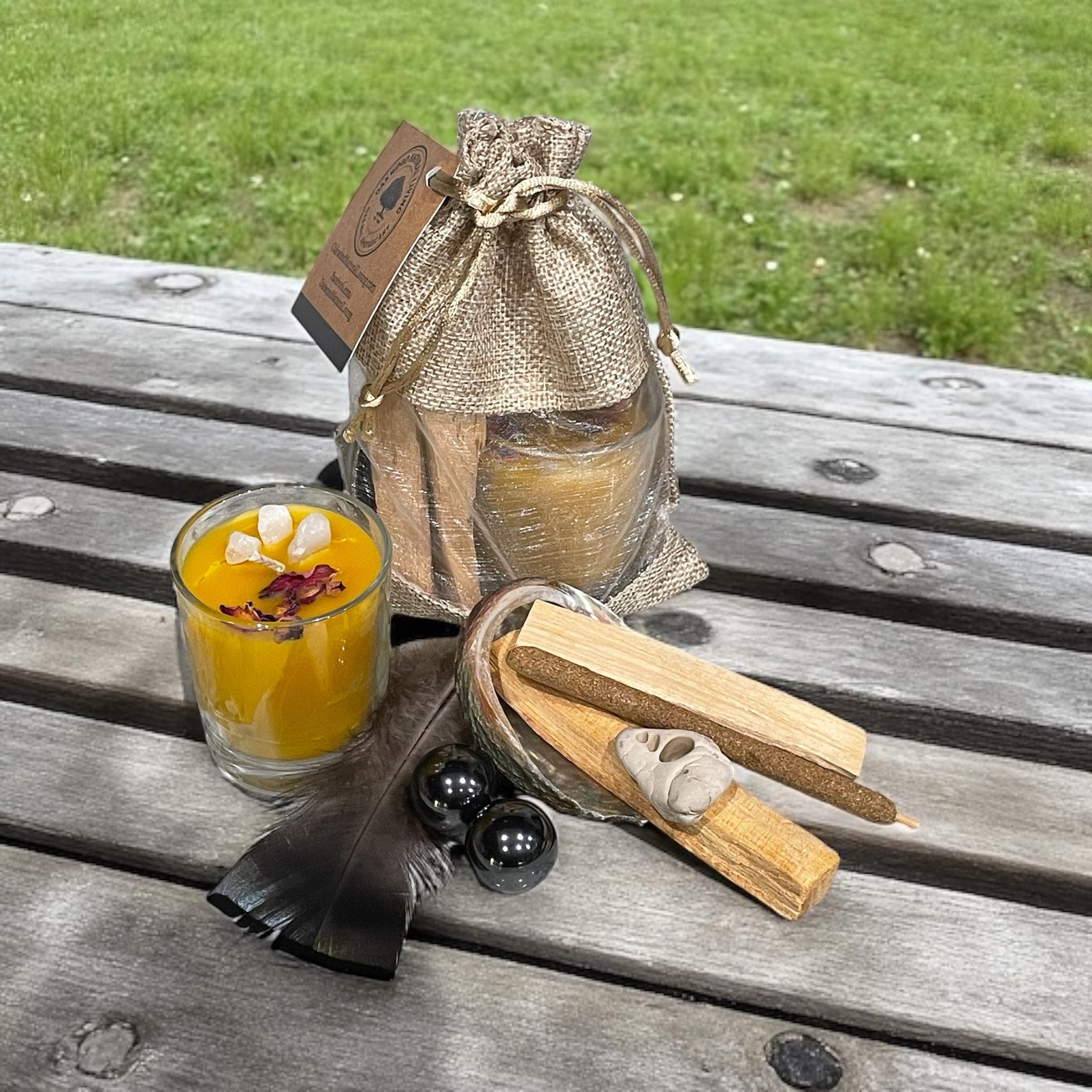 Cleansing Kit - Includes an iridescent authentic abalone shell that is traditionally used with smudging as a dish. This is where you rest your sage when burning. A tightly bundled sage wand, sustainably sourced palo santo wood stick, hand poured 100% beeswax tea light, natural turkey feather and a carved selenite heart stone. Selenite is the ultimate cleansing stone and to be placed next to the abalone while smudging. Using the feather is traditional in dispersing the smoke during meditation.