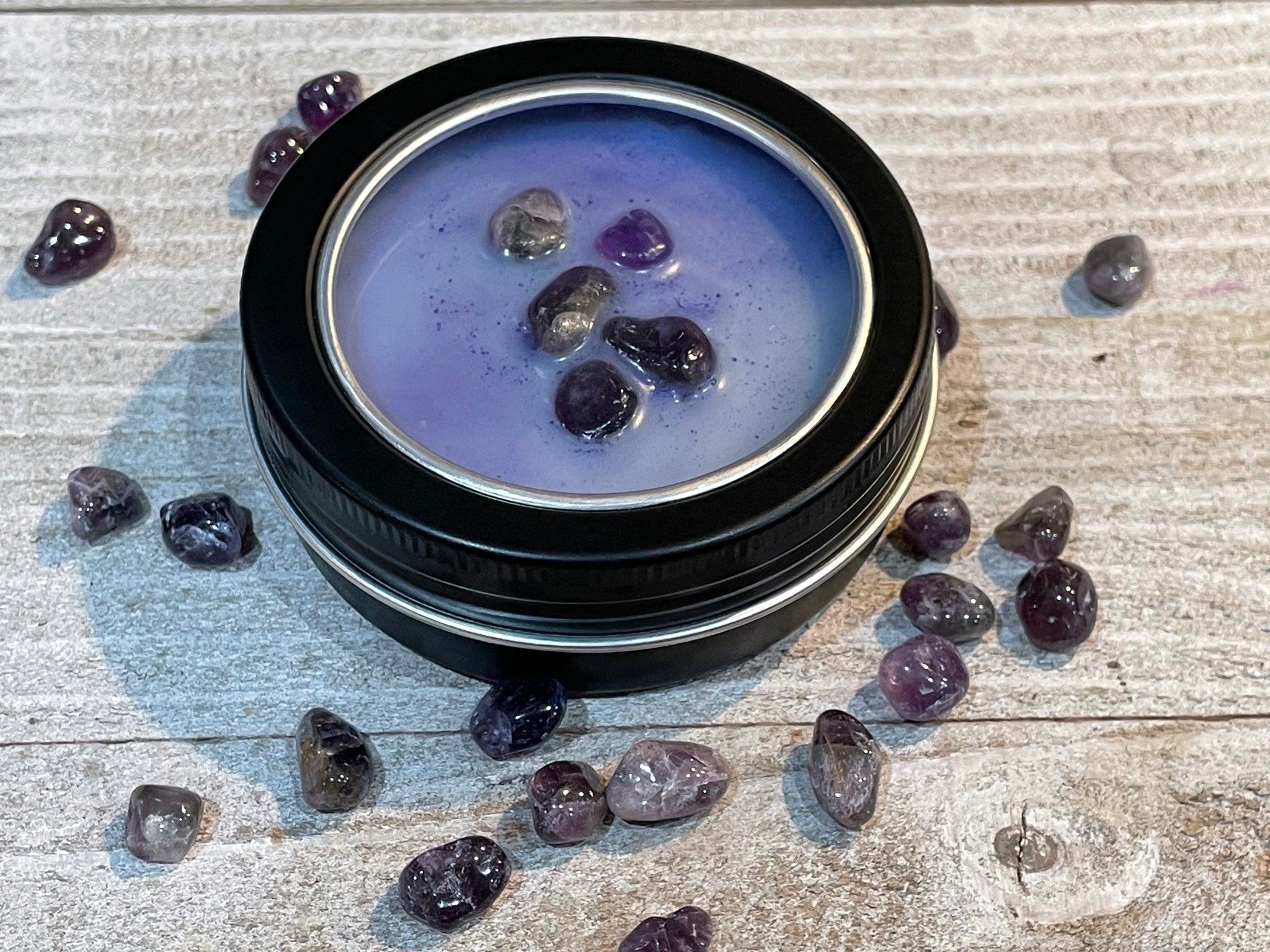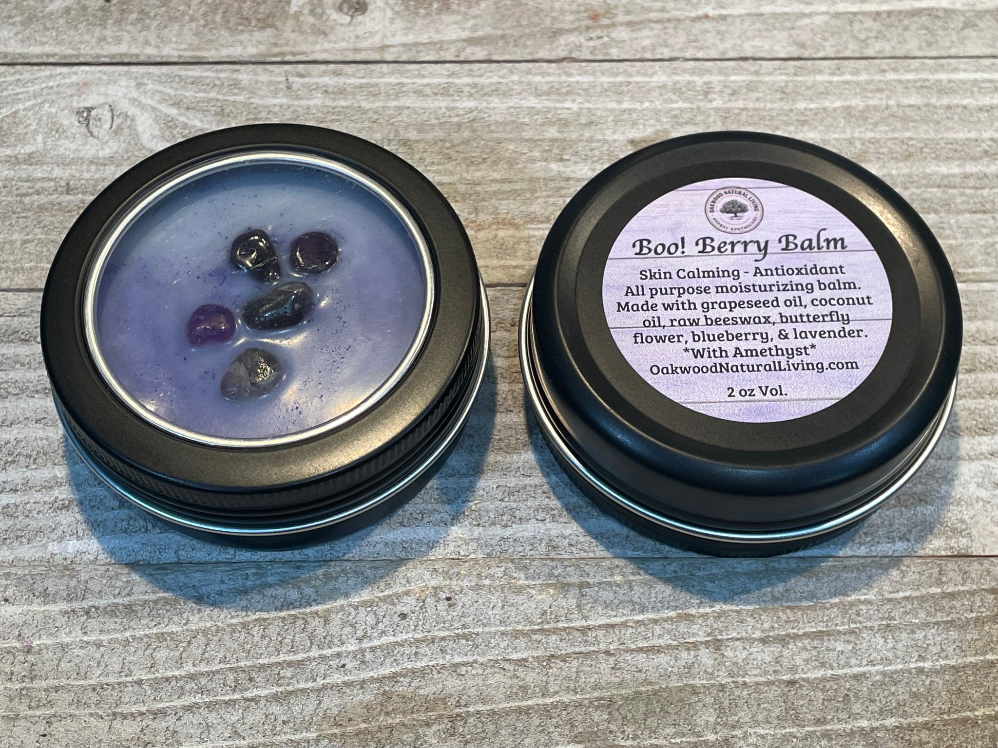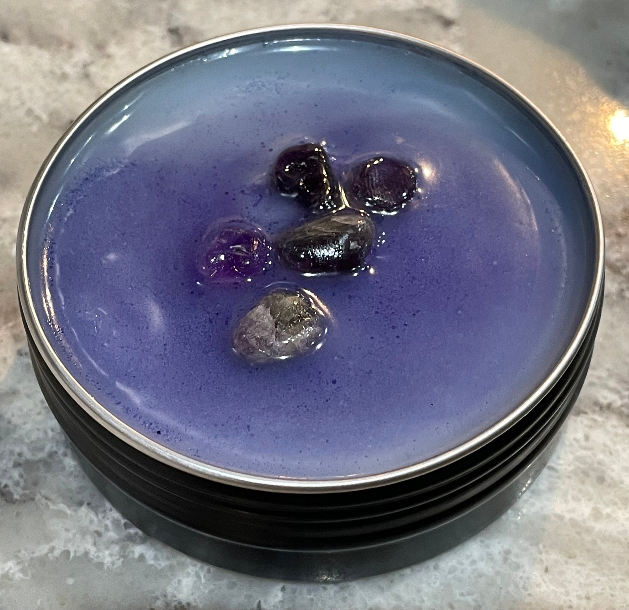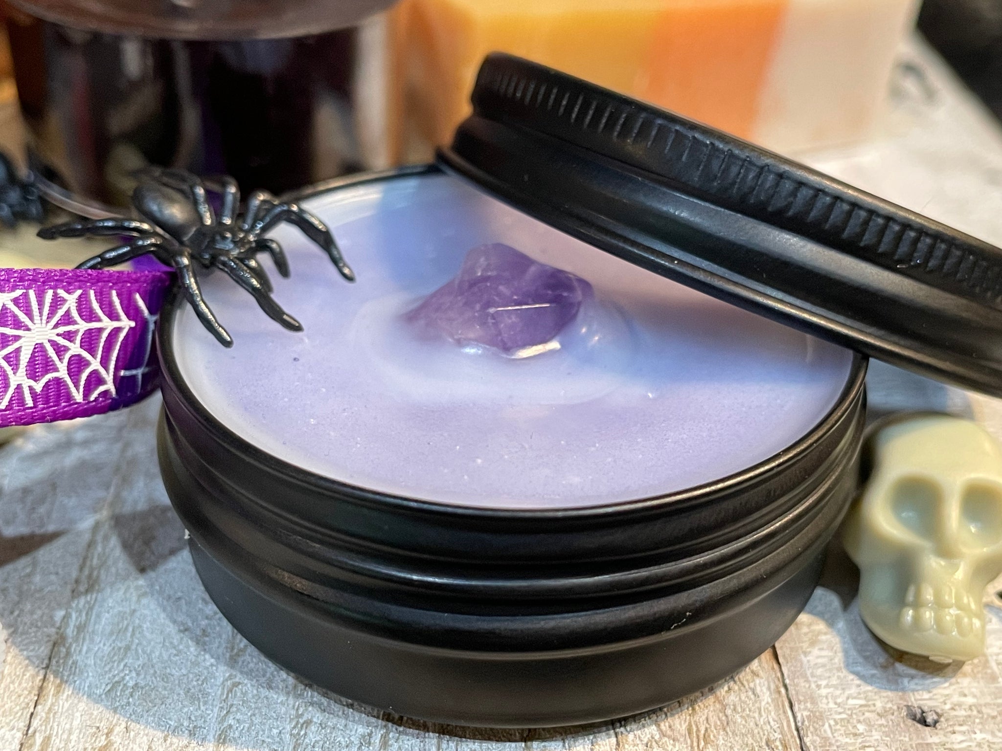This is a limited seasonal batch for our Halloween Magic and Potions event. Please keep in mind that the amethysts are raw and unpolished in their natural state. Each one is unique in every tin of balm.  The balm does not contain any preservatives, additives and has a 1 year shelf life.  Please keep in a cool area and out of direct sunlight with the lid secure, for best possible results.