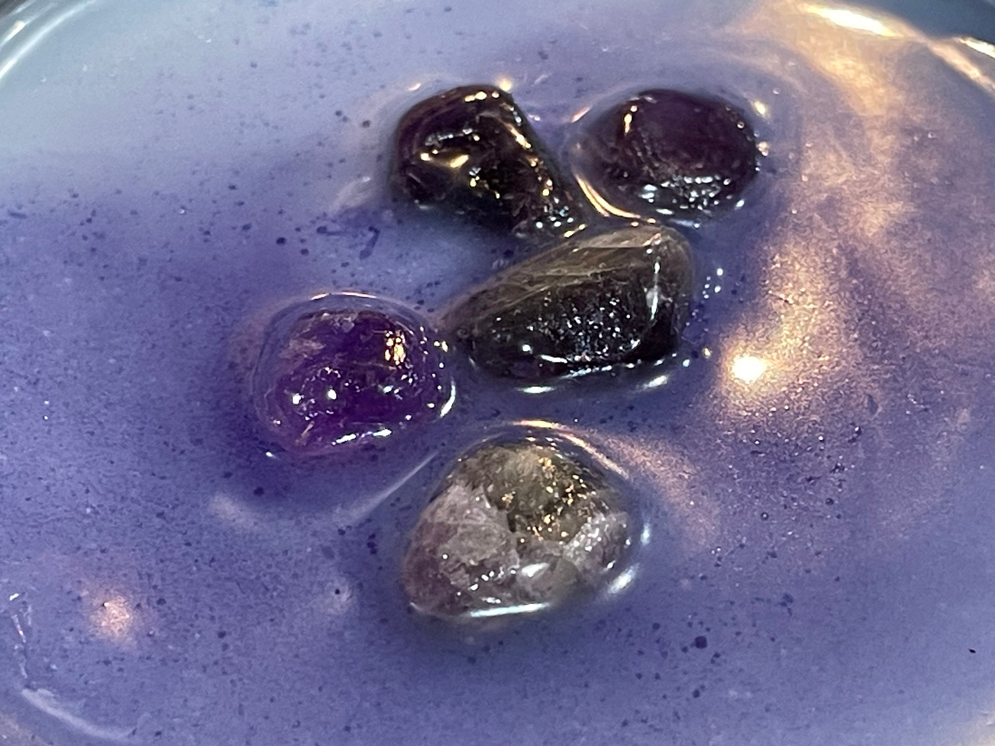 We have included  natural raw amethyst stone that is nestled gently in the center of the balm to infuse its crystal powers with the plant powers.  Amethyst in particular is used to help with stress, strain and helps sooth the active mind. Its  the perfect semi precious stone for this nourishing balm.
